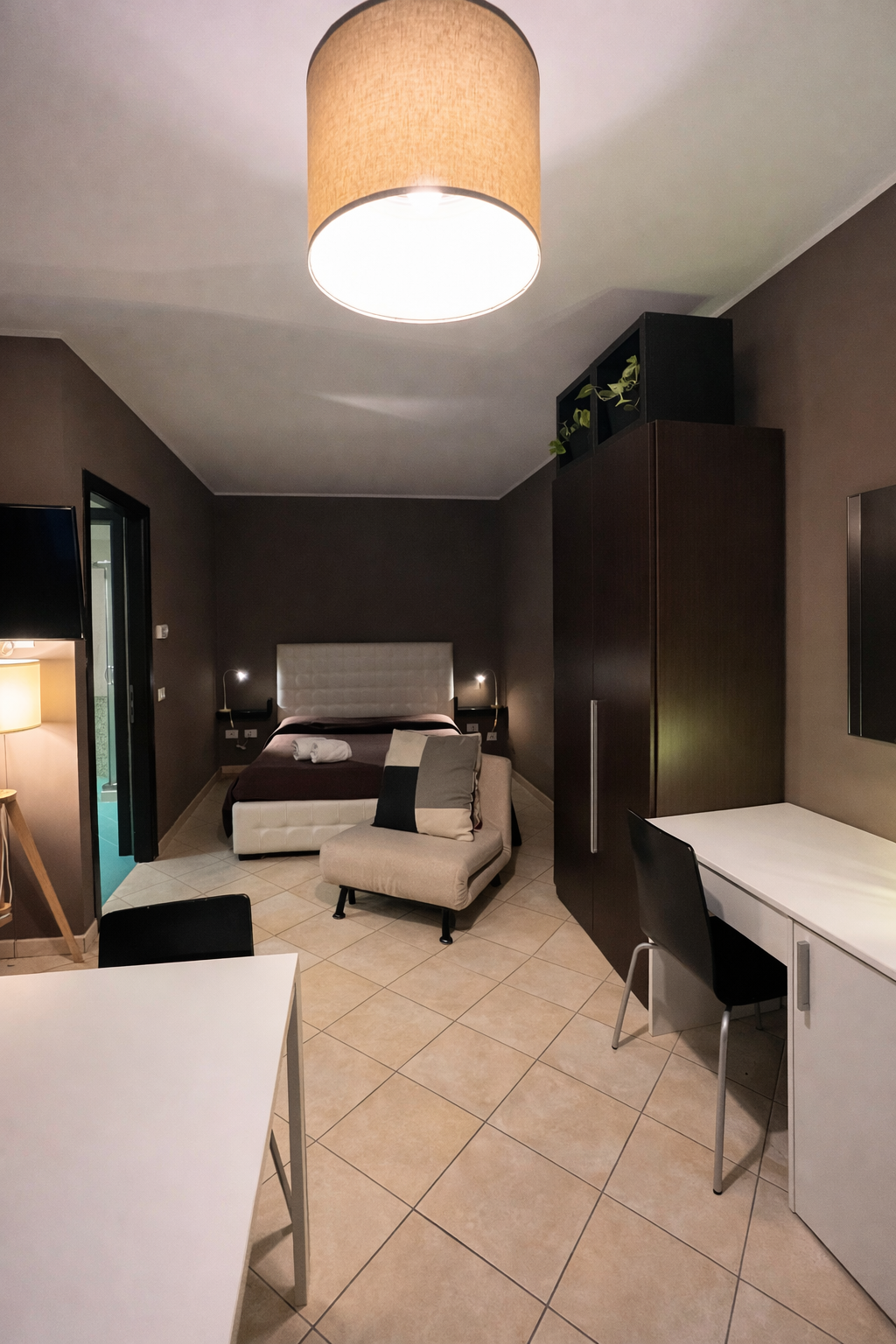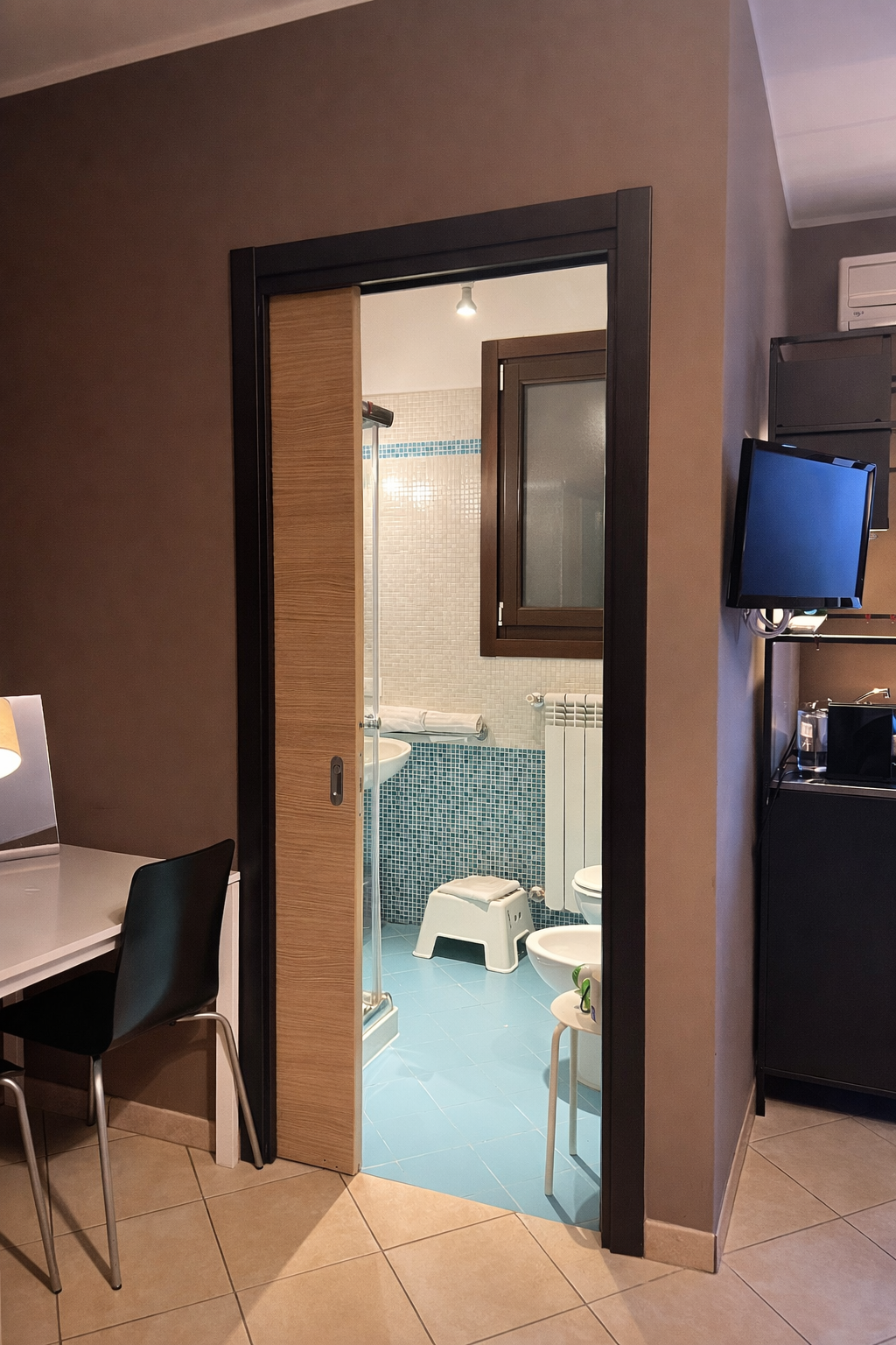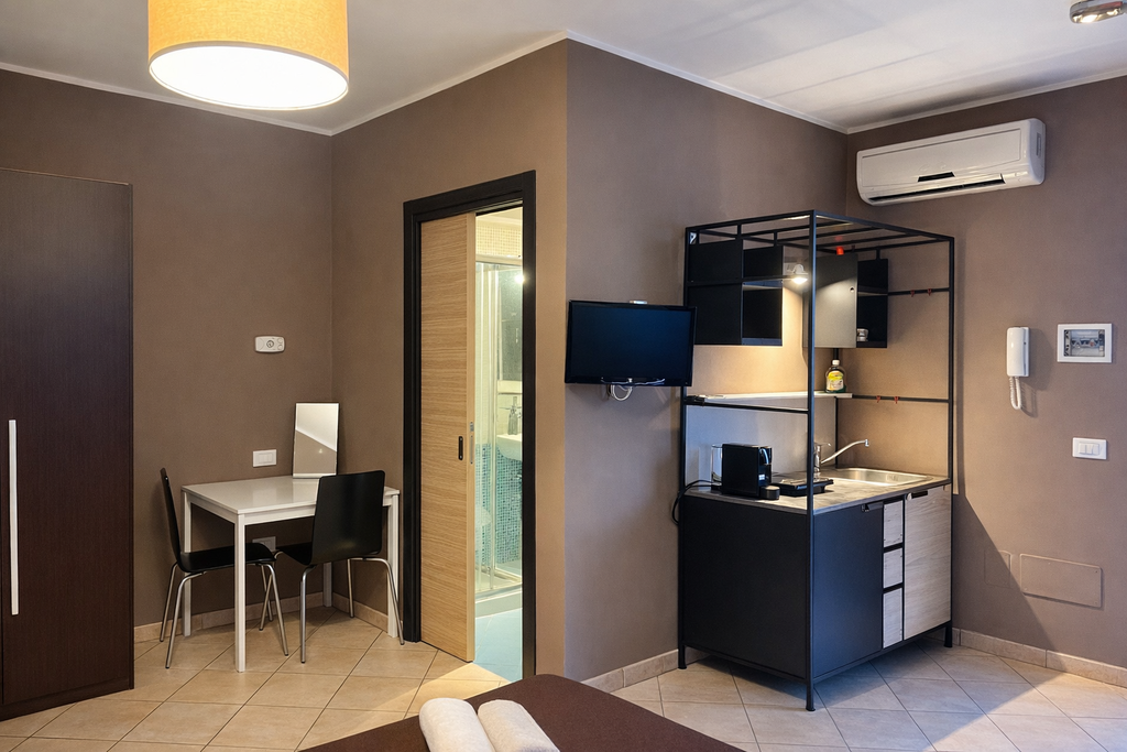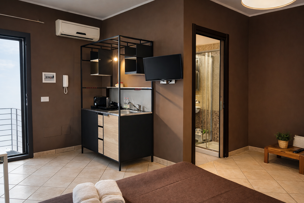 Camera con spazi più ampi ingresso indipendente, bagno privato e angolo cottura essenziale (piastra a induzione, piccolo lavello, frigobar e macchina del caffè), aria condizionata, Wi-Fi, TV LCD.