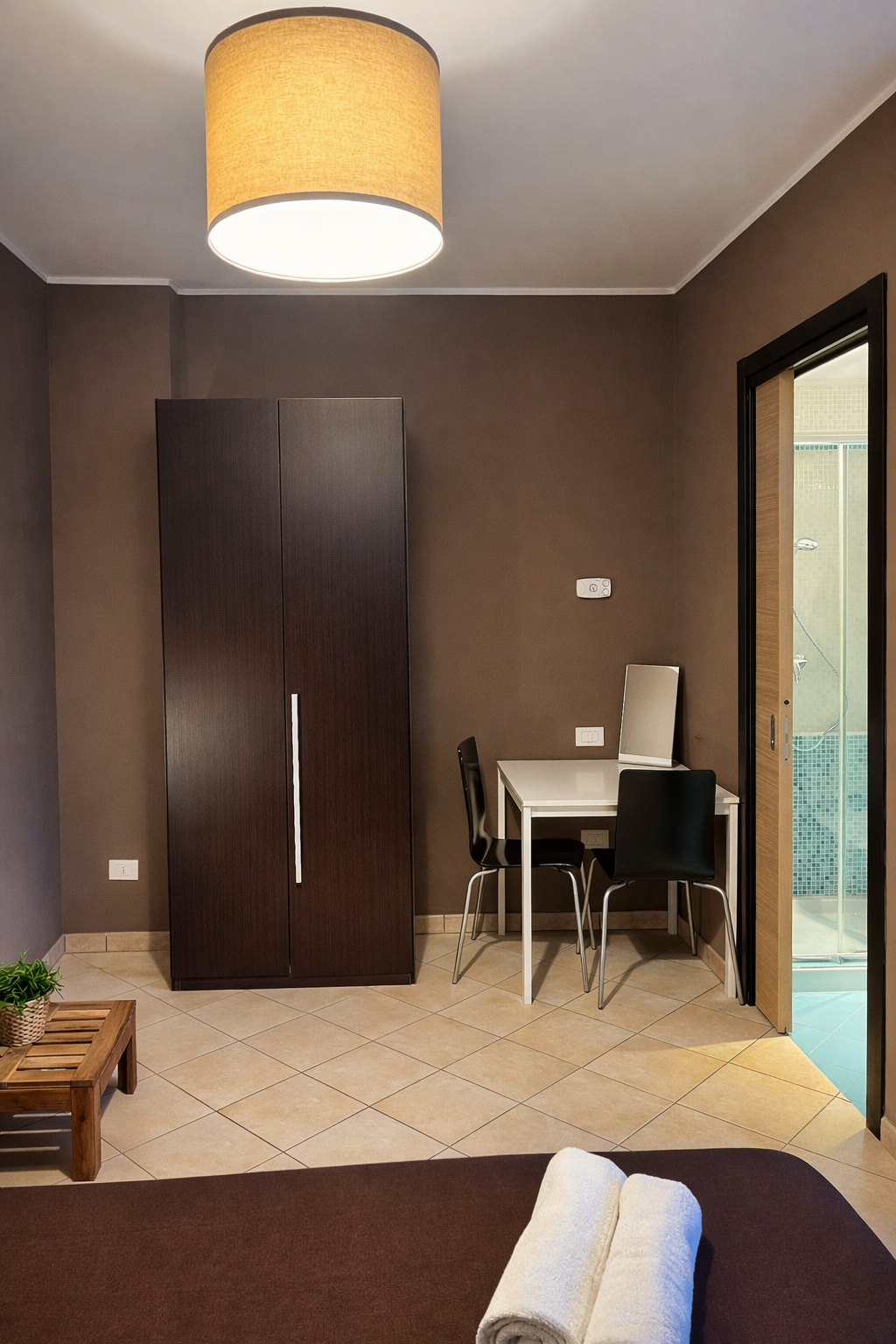 Camera con ingresso indipendente, bagno privato e angolo cottura essenziale (piastra a induzione, piccolo lavello, frigobar e macchina del caffè), aria condizionata, Wi-Fi, TV LCD.
